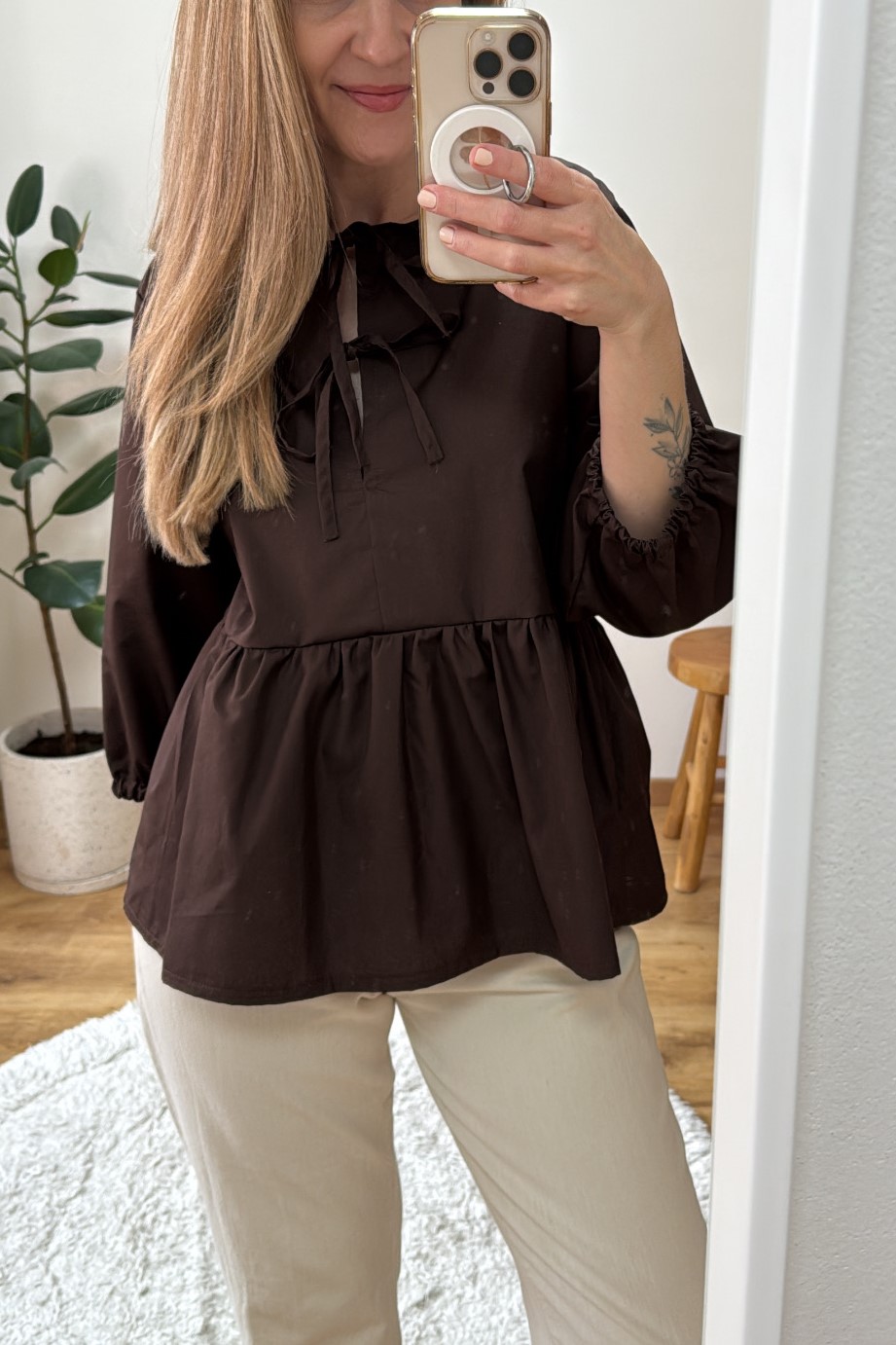 Lotty - pohodlný top s romantickým vázáním je naším letošním popelínovým nováčkem a věříme, že se stane Vaším oblíbencem. Při tvorbě jsme vycházeli ze střihu našich nabíraných šatů LOTTY které už dobře znáte. 3/4 ní rukáv je pohodlný, prostorný a zakončený širší a volnější gumičkou.