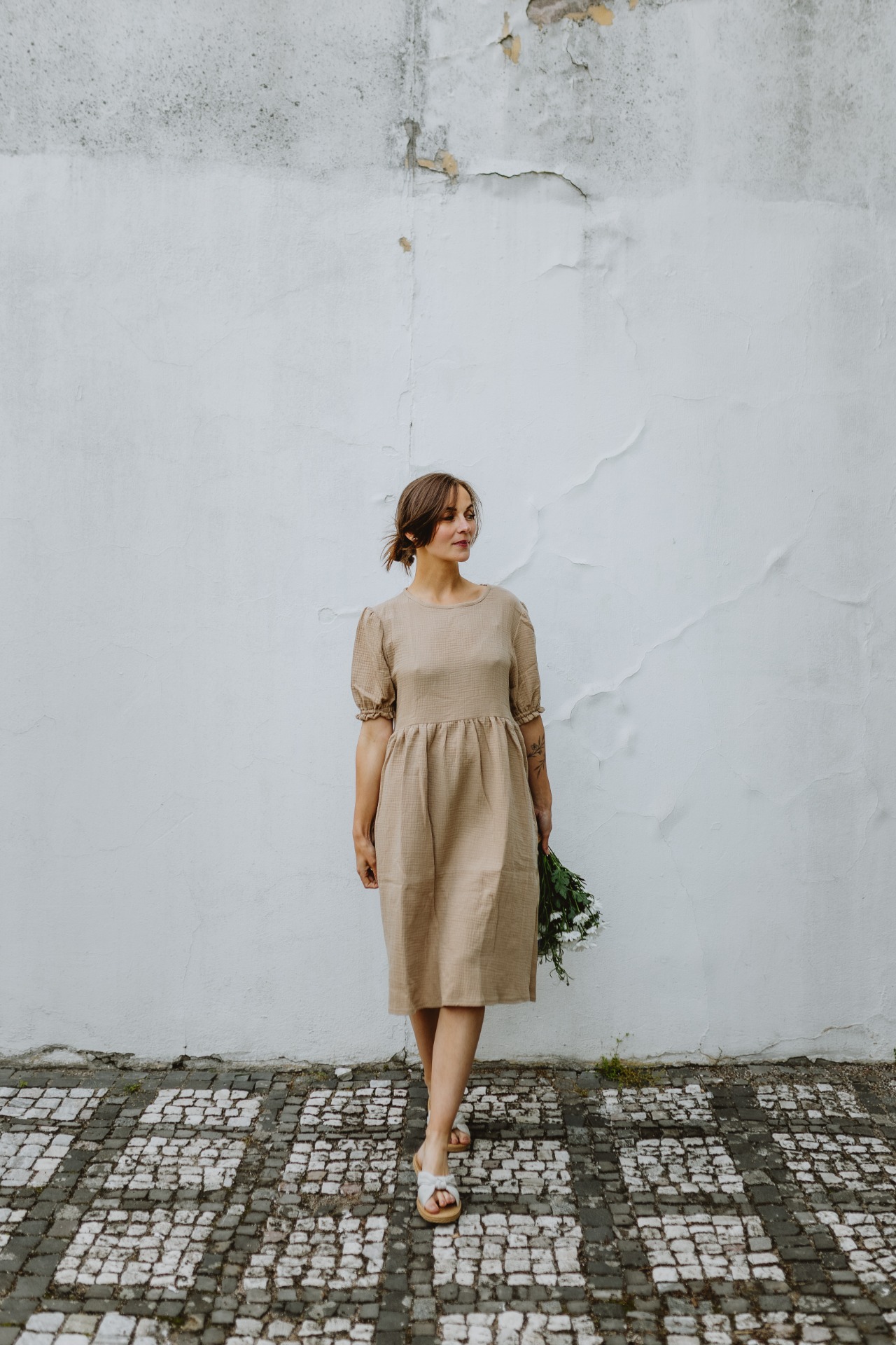 Maddy - pohodlné nabírané šaty v délce lehce pod kolena s kapsami ve švu už z naší nabídky znáte. Variantu Maddy 2025 jsme oproti loňské variantě o  chlup prodloužili, doplnili vzdušnějším rukávem do gumičky a přidali romantický detail, který si zamilujete.