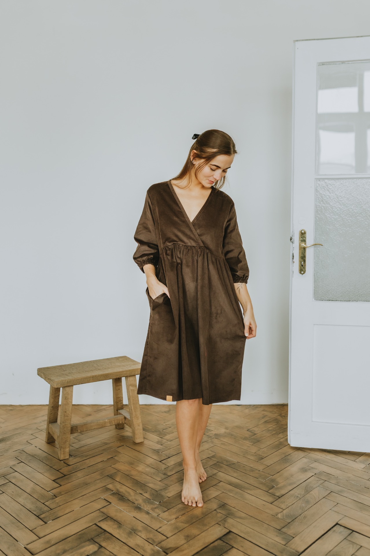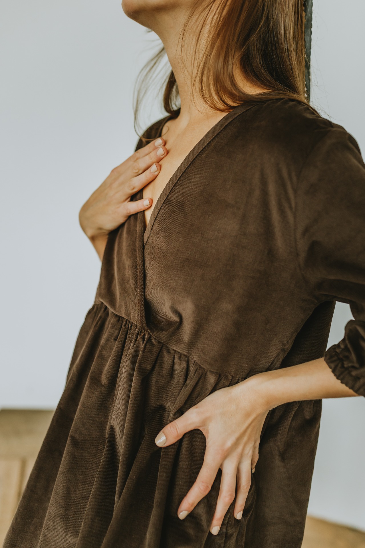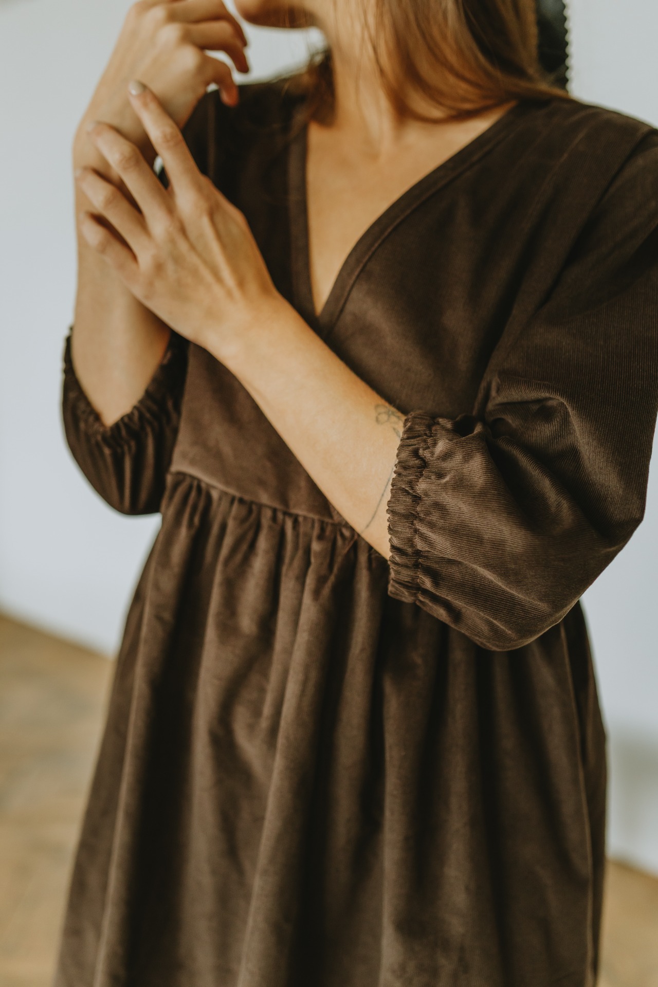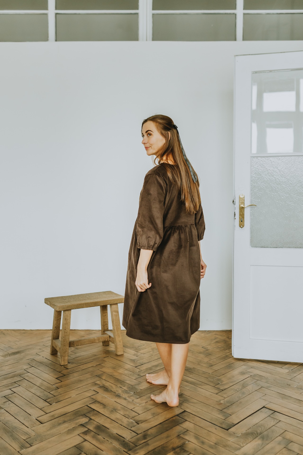 Manšestrové šaty Sally jsou sourozencem šatů Helly s maličko zkráceným a zúženým rukávem do gumičky.